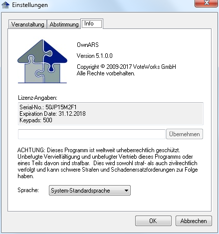 OwnARS kann auch ohne Lizensierung auf beliebig vielen Rechnern installiert werden. Die Software ist mit bis zu 5 Abstimmgeräten voll lauf- und testfähig. Ohne angeschlossene Hardware können Ergebnisse über die Computertastatur (1=Ja, 2=Nein, 3=ENTH) simuliert werden. Nach der Vorbereitung kann die Datei *.osf auf einen lizensierten Rechner übertragen werden. Alternativ kann die Test- und Demolizenz über einen im Menü Einstellungen/Info einzutragenden Lizenzcode freigeschaltet werden.
