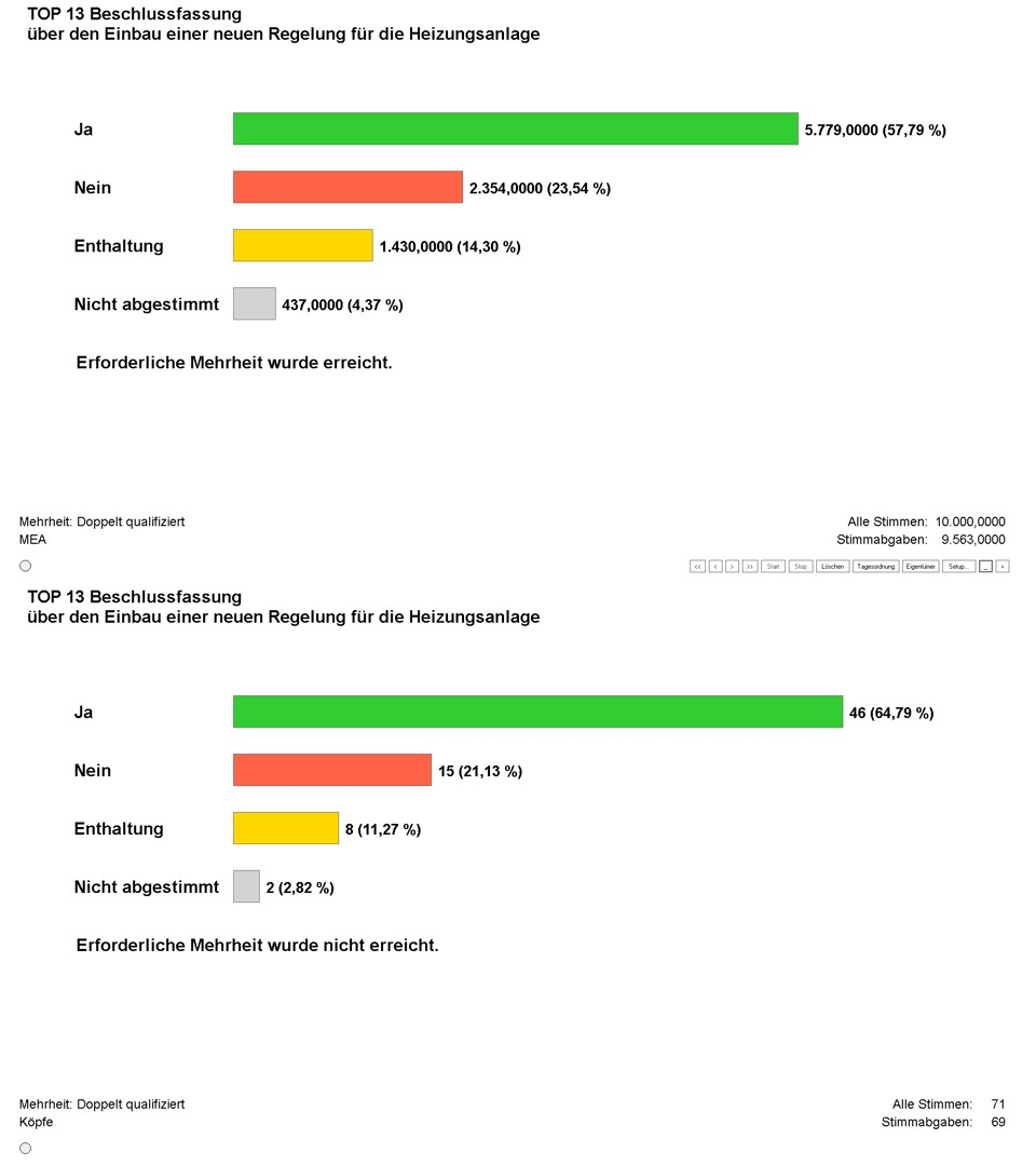 In der Tabelle Tagesordnung können Sie jedes "Mehrheitserfordernis" mit jedem "Stimmrechtsprinzip" kombinieren. D.h. Sie decken auch die Fälle ab, in denen eine qualifizierte Mehrheit (mehr als 75% der Köpfe und gleichzeitig mehr als 50% der MEA´s) für den Beschluss stimmen müssen. Über den Tastaturbefehl "Strg+G" (G wie Gewicht) können Sie zwischen der Ergebnisanzeige nach Köpfen und MEAs hin- und herschalten. Dabei wird in jeder einzelnen Anzeige deutlich ob das Quorum erreicht wurde.