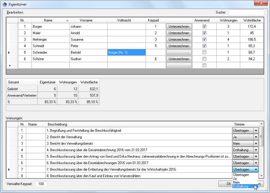 Neben der Beschlussnummer, dem Tag und der Uhrzeit der Abstimmung, sowie dem Tagesordnungsgegenstand, dem Quorum und den Gesamtergebnissen, wird (bei entsprechender Einstellung der Optionen im Setup) auch das individuelle Abstimmverhalten der einzelnen Eigentümer dokumentiert.